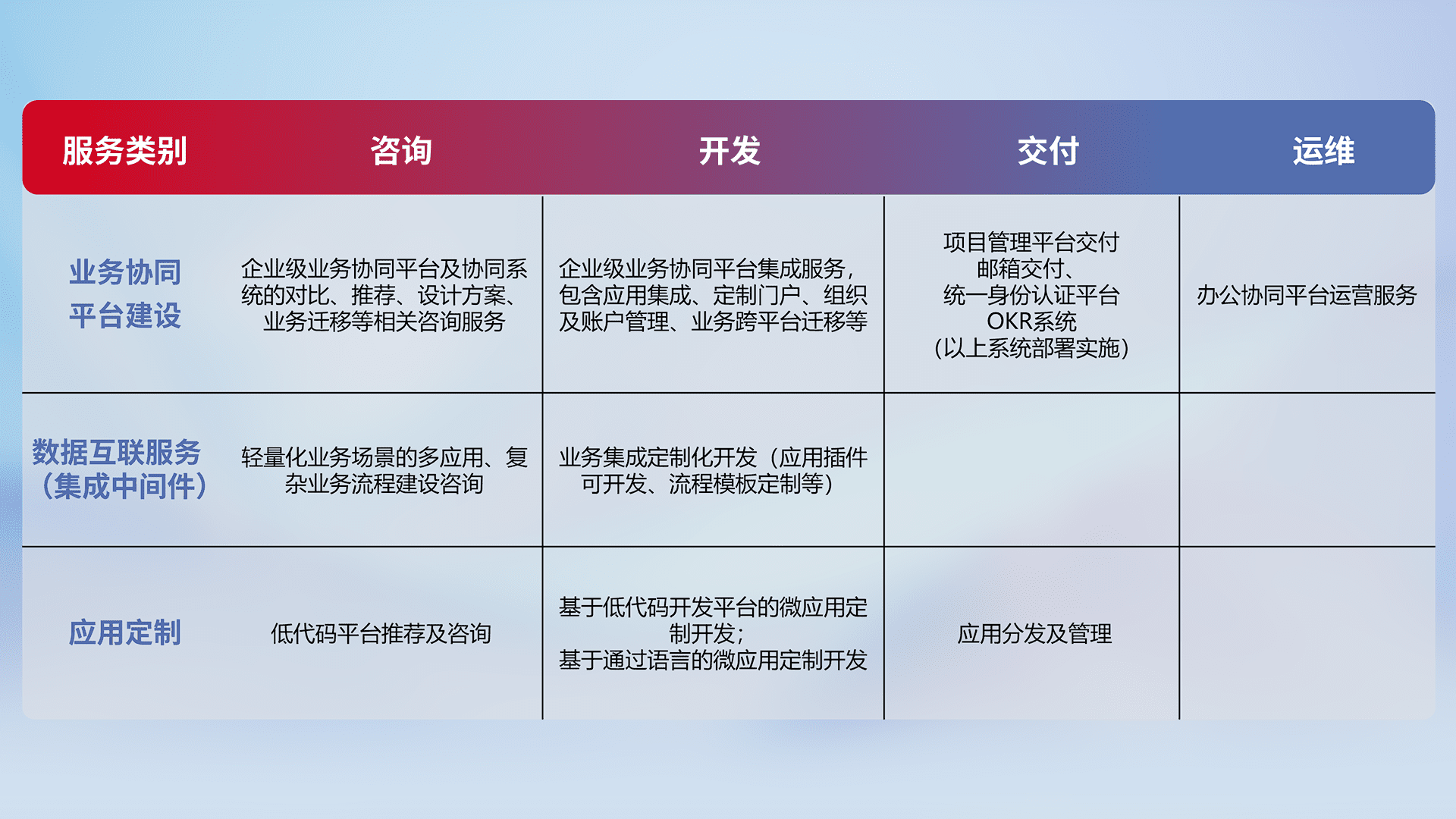 针对钉钉、、企微、、、IDaas等平台级产品提供产品的规划、、、方案、、、交付、、、、定制化开发等服务,,,,实现如统一协同办公、、智能客户服务、、、混合会议管理、、、、智能数据查询、、、、等业务场景,,实现数字化转型。。